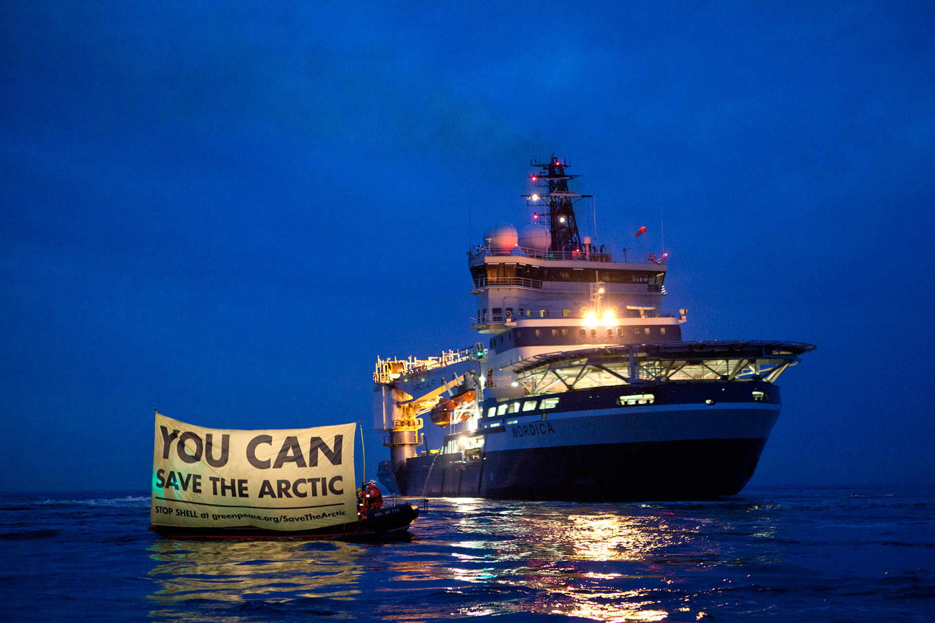 Europa, Deutschland, Schleswig Holstein, Fehmarn, Ostsee, Greenpeace Aktion, Stoppt Shell, Greenpeace Protest Aktion auf der Ostsee, Umweltschuetzer wollen den Eisbrecher Nordica aus Helsinki auf dem Weg in die Arktis aufhalten, damit gegen die Plaene von Shell protestieren, Shell will im Sommer 2012 Probebohrungen in der Arktis starten, Greenpeace fuerchtet um das sensible Oekosystem der Arktis, das durch Bohrunfaelle sowie industrielle Massenfoerderung gefaehrdet wird, der Eisbrecher dreht sich vor der Kadettrinne zwei Stunden auf der Stelle und die Besatzung wehrt erfolgreich die Versuche der Kletterer, auf das Schiff zu gelangen, ab. auch mit Stacheldraht, Wasserkanonen verhindern das Bemalen des Schiffes, Schlauchboote, Aktivisten, Zoodiak, Banner You can save the arctic, stop shell, nachts,