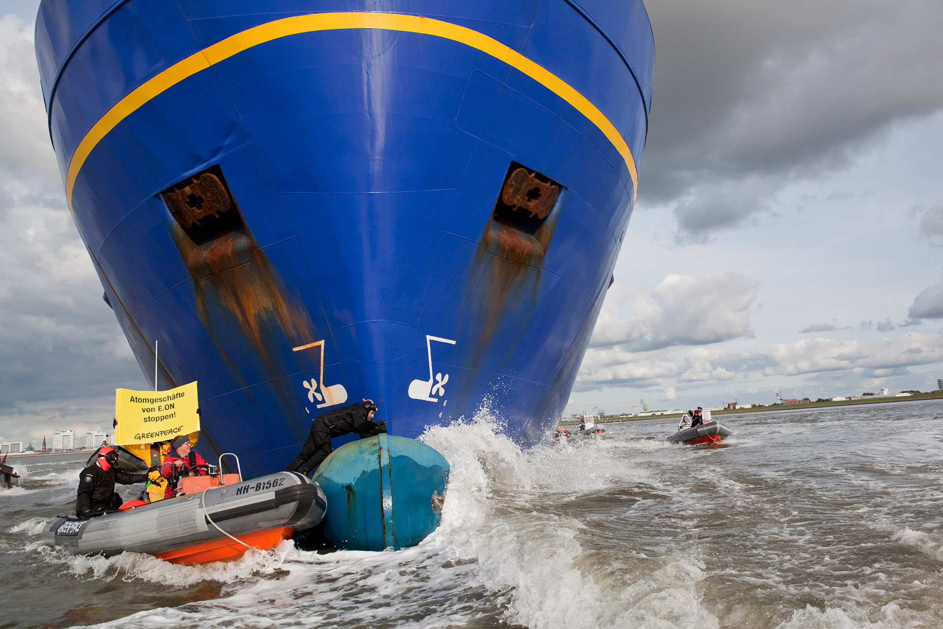 Europa, Deutschland, Niedersachsen, Nordsee, Greenpeace, Aktion, Aktivisten, Mox Transporte, aufgearbeitetes Plutonium, Brennstaebe, werden auf dem Schiff Atlantic Osprey aus Sellafield nach Nordenhamm gebracht, ca 50 Greenpeacler, Polizei, Wasserschutzpolizei, Kuestenwache, Weser, Unterweser, Atomtransporte, Atomkraft, 23 09 2012
