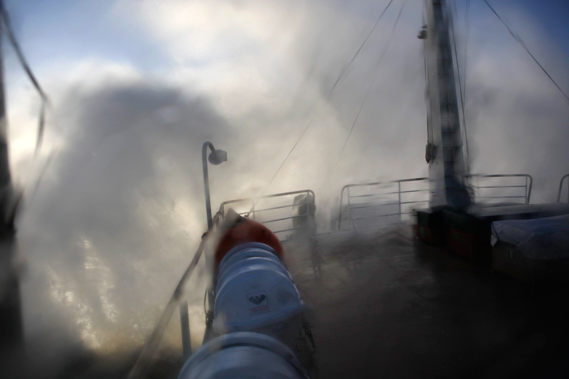 vor Schottland auf dem Weg zu der Gasplattform Elgin Europa, Nordsee, vor Schottland, mit Greenpeace auf dem Weg zu der leckgeschlagenen Gasplattform Elgin Previous Image Next Image