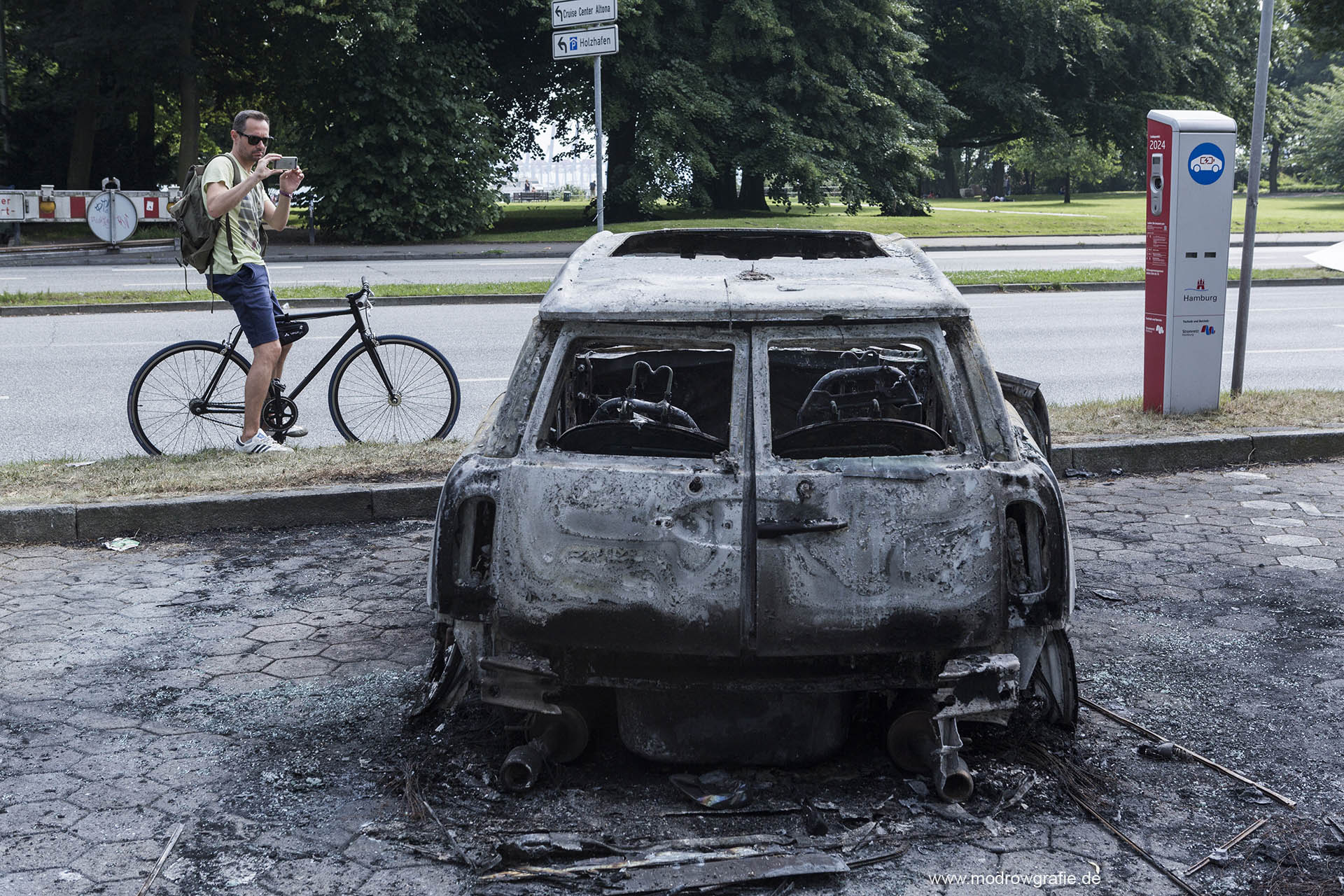 Deutschland; Europa; Hamburg, Spur der Verwuestung in Altona, Vermummte haben Autos angezuendet , vor dem Altonaer Rathaus, Fenster zerstoert, G20, 07.07.2017, G20 Summit,