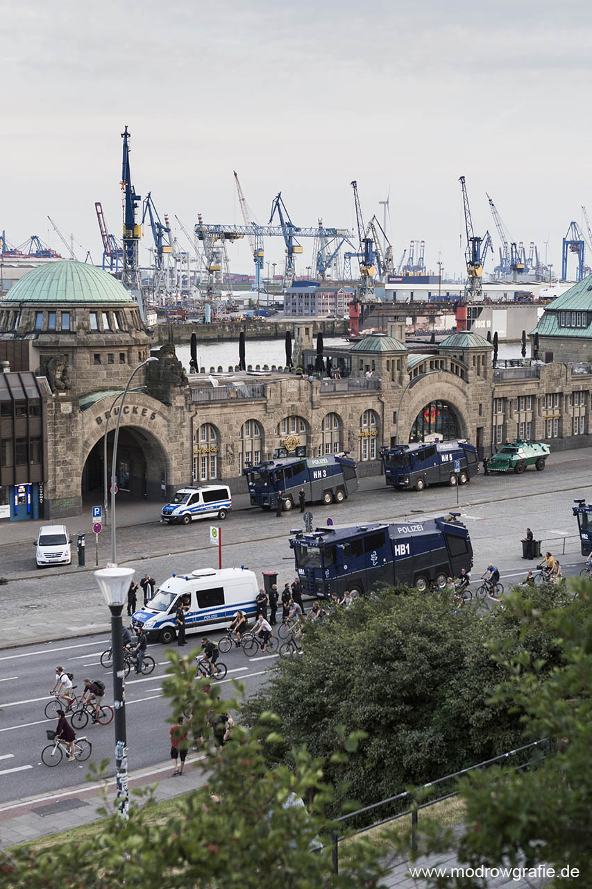Deutschland; Europa; Hamburg, St Pauli Landungsbruecken, Wasserwerfer, Abend, G20, 07.07.2017, Fahrrad Demo, Critical Mass, G20 Summit,