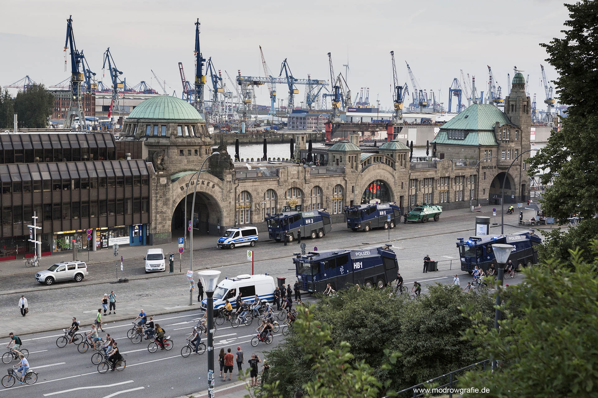 Deutschland; Europa; Hamburg, St Pauli Landungsbruecken, Wasserwerfer, Abend, G20, 07.07.2017, Fahrrad Demo, Critical Mass, G20 Summit, Previous Image Next Image