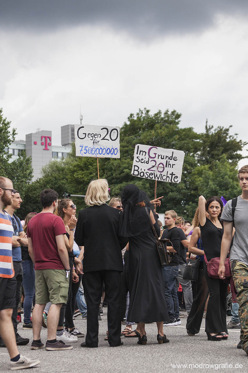 Deutschland; Europa; Hamburg, G20, 08.07.2017, Demonstranten, Protetler sitzen auf der gesperrten Strasse, Ludwig Erhardt Strasse, vor den tanzenden Tuermen an der Reeperbahn, Sitzblockaden, Demonstration, Kundgebung, Wasserwerfer, Polizei, G20 Summit,