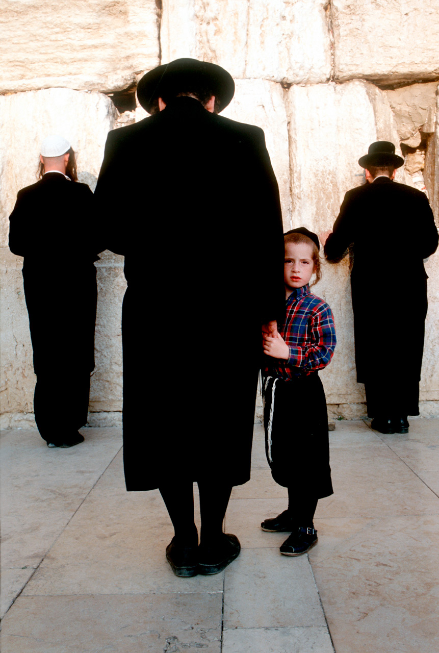 Israel, Jerusalem, Tempelberg, orthodoxe Juden Tempelberg, Western Wall, dei Klagemauer, Heiligtum der orthodoxen Juden, Vater und Sohn, Neugierde, beim Gebet Previous Image Next Image