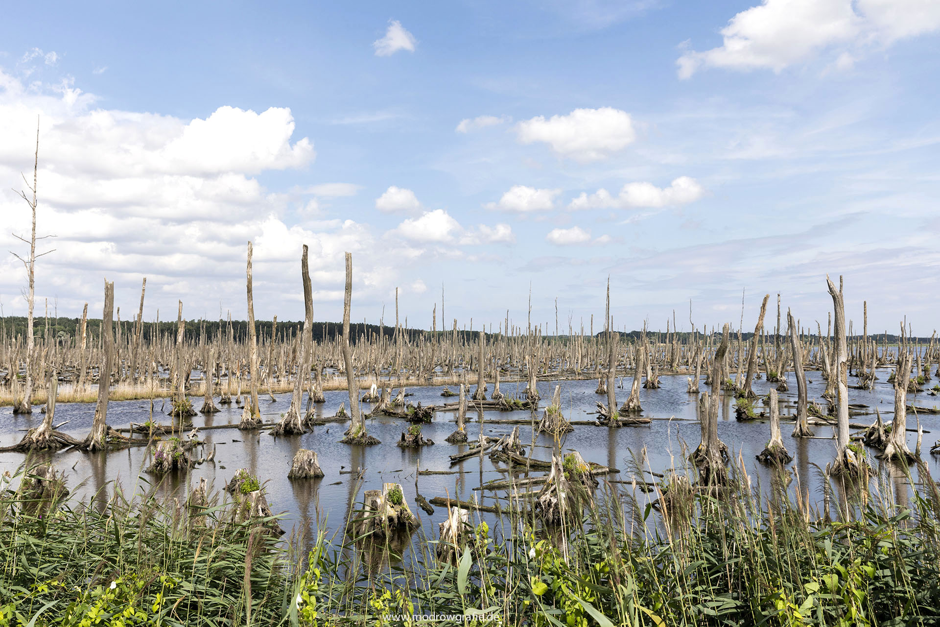 Europa, Deutschland, Mecklenburg- Vorpommern, Peenestrom bei Pinnow, abgestorbene Baeume, Erlen, Ueberflutungsgebiet, Ausgleichsflaechen, engl.: Europe, Germany, Mecklenburg-Western Pomerania, Peenestream, dead Trees, <birds, Previous Image Next Image