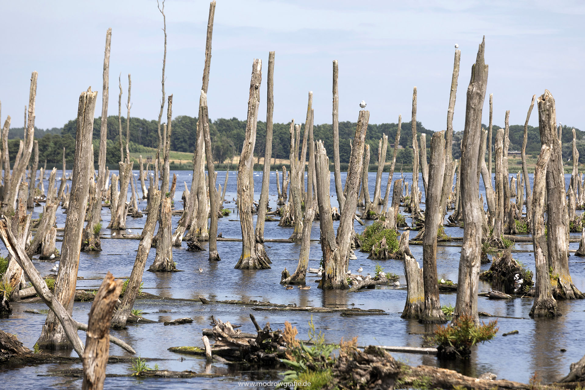 Europa, Deutschland, Mecklenburg- Vorpommern, Peenestrom bei Pinnow, abgestorbene Baeume, Erlen, Ueberflutungsgebiet, Ausgleichsflaechen, engl.: Europe, Germany, Mecklenburg-Western Pomerania, Peenestream, dead Trees, <birds, Previous Image Next Image