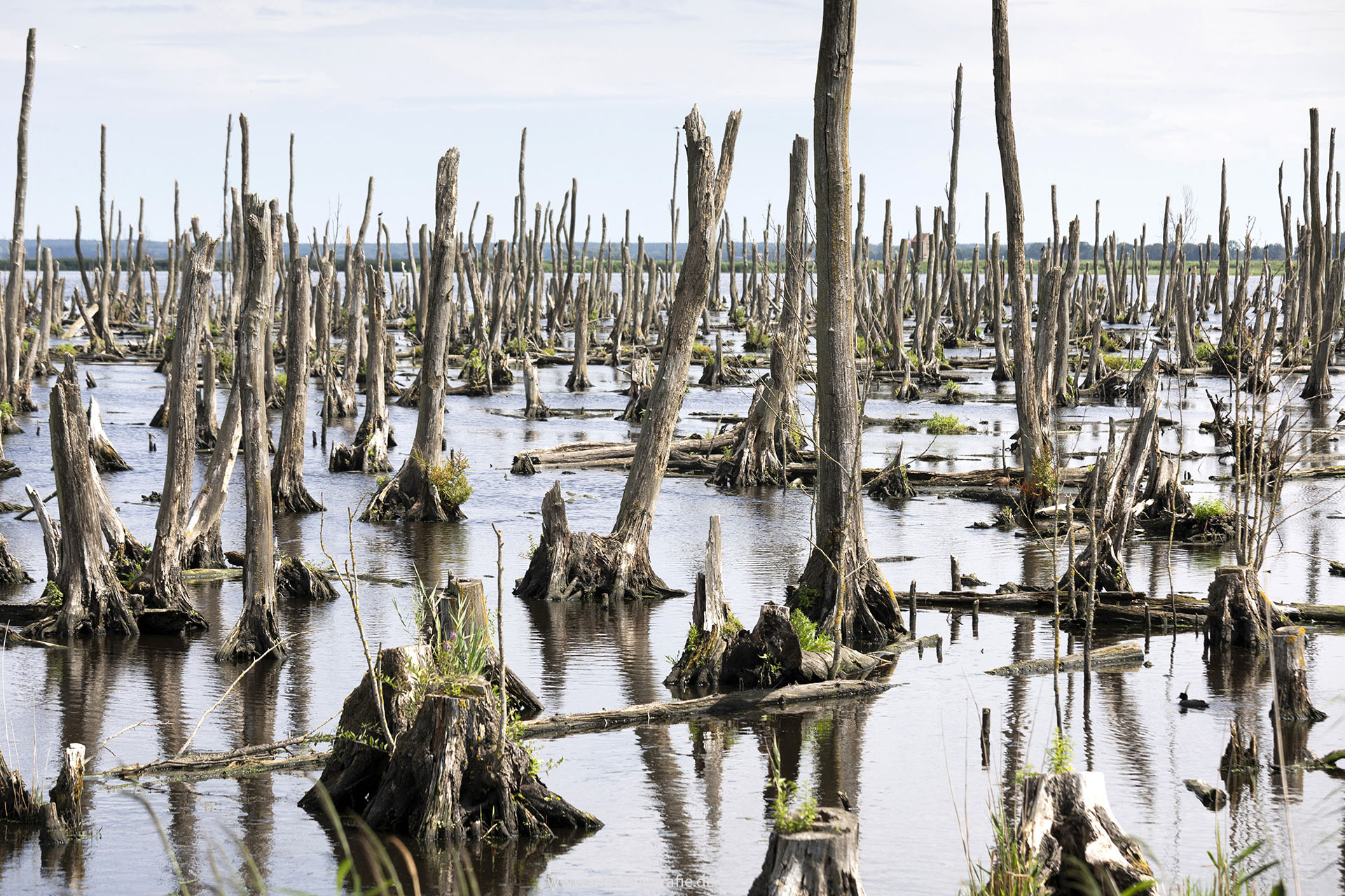 Europa, Deutschland, Mecklenburg- Vorpommern, Peenestrom bei Pinnow, abgestorbene Baeume, Erlen, Ueberflutungsgebiet, Ausgleichsflaechen, engl.: Europe, Germany, Mecklenburg-Western Pomerania, Peenestream, dead Trees, <birds, Previous Image Next Image